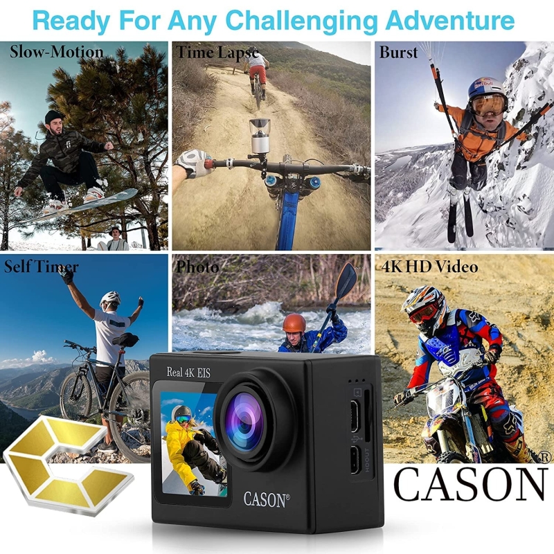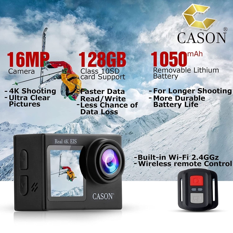 • CASON Sports Camera, with 4k/ 30fps smooth video resolution and photographs at 16 MP, can better help you capture every excellent moment while vlog recording,skiing, skating, swimming, snorkeling, diving,and more.