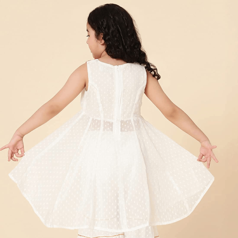 • Beautiful embroidery on the front of the kurta that perfectly fits on to the look and adds to its style quotient. And a beautiful matching sharara that completes the look of your princess making it a must-have occasionwear for her.