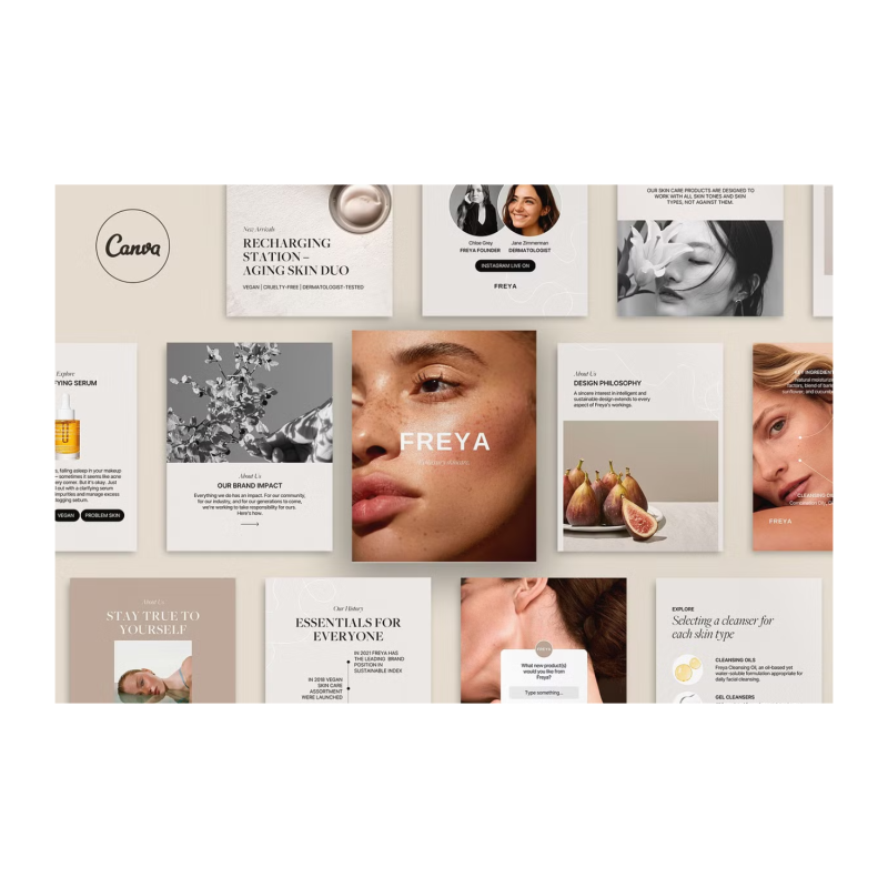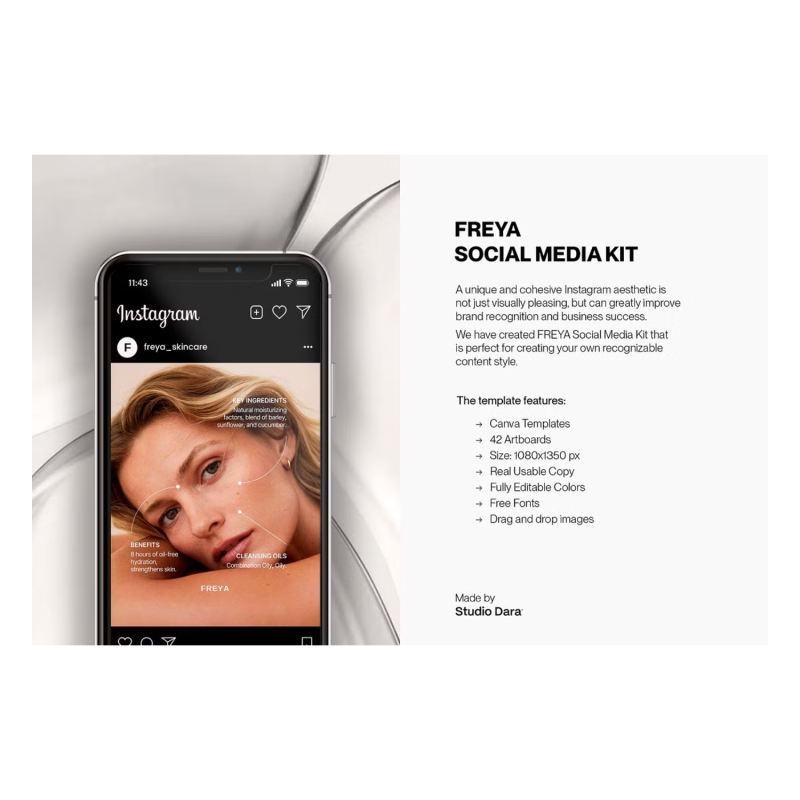 The Freya Social Media Kit by Studio Dara is created in Canva and features a minimalist aesthetic, perfect for skincare& beauty brands, influencers, and design studios. The pack includes 42 unique templates in 1500x1500 pixels. Most users browse their Instagram feeds on their phone—and Instagram’s portrait image size is prime for mobile. Portrait posts are optimized for the Instagram algorithm and can be super eye-catching in a feed full of square images. We have created different portrait post styles so that you can share about products, services, news, promotions, trends, quotes, vibrant photos, call-to-action messages, and more to attract the right target audience. Save your time, and money and produce high-quality work.