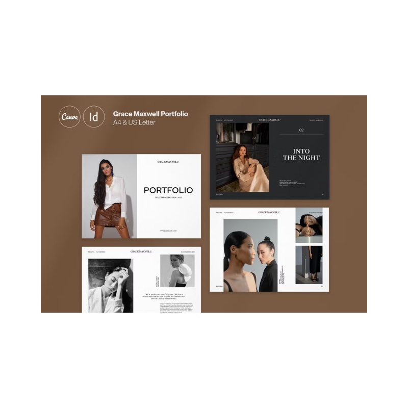 GRACE MAXWELL is a fully customizable portfolio layout created for Adobe InDesign & Canva. The template contains 28 pages and designed in both A4 (297x 210mm) & US letter (8.5"x11"). It's perfect for all designers, photographers, illustrators, architects, stylists, artists, art directors, agencies of all sizes, and more.